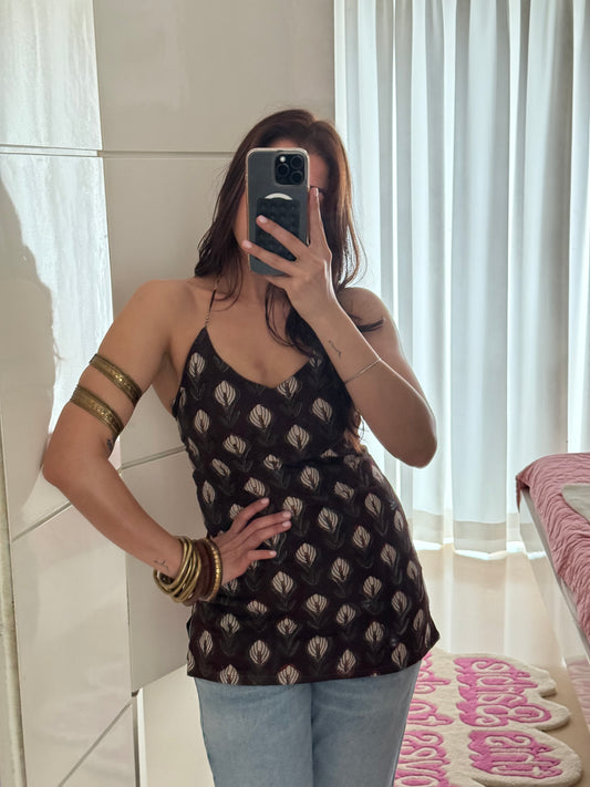 Sukh Ajrakh Dabu Brown Handblock Cotton Halter Top