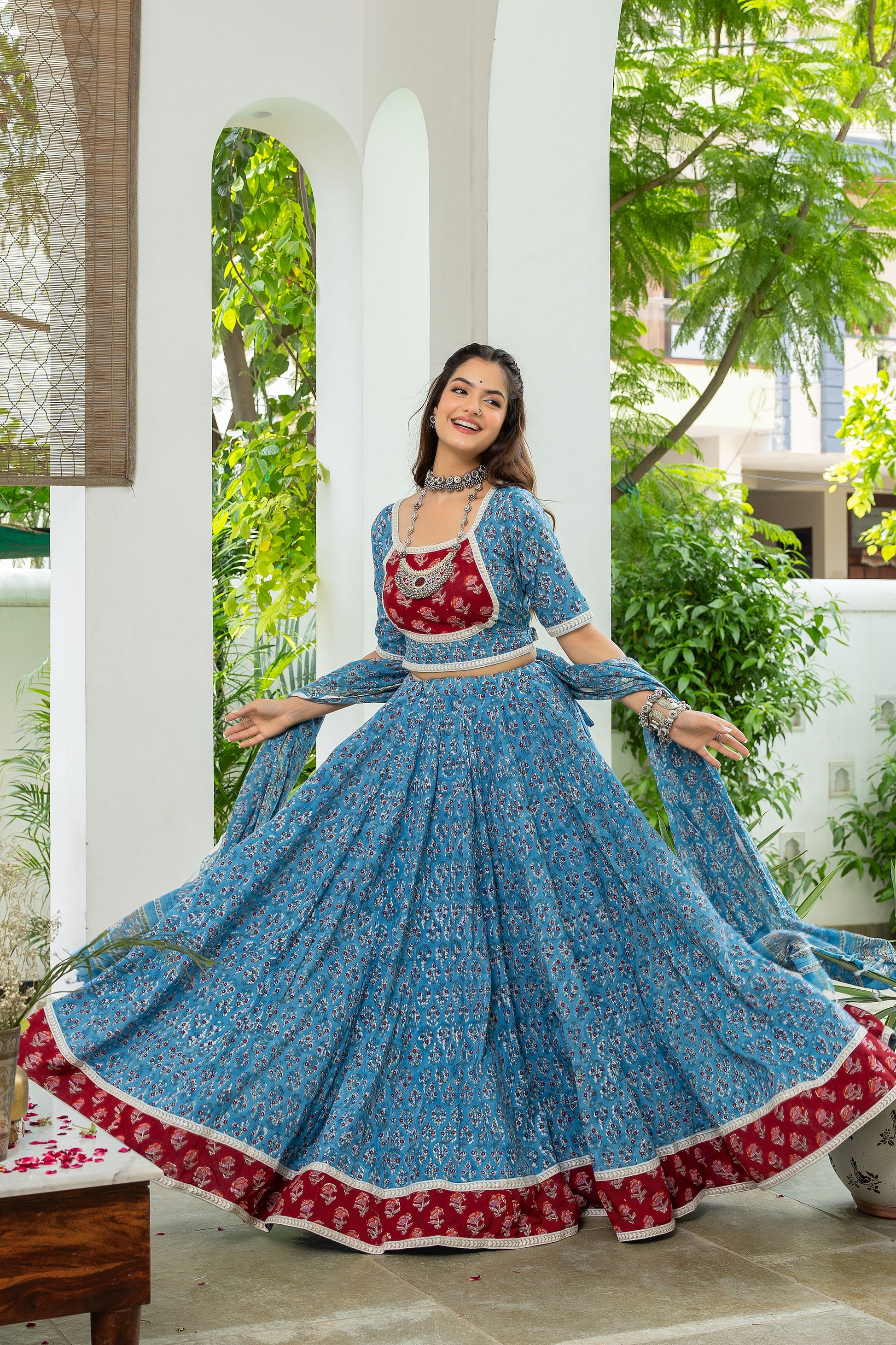 The Mihika Handblock Cotton Lehenga is a stunning blend of tradition and style. Featuring the intricate Bagru print, this lehenga set showcases exquisite craftsmanship on soft, breathable fabric. The flowing skirt, paired with a beautifully detailed blouse and matching dupatta, creates a timeless silhouette. Perfect for festive celebrations, this lehenga brings cultural heritage to the forefront of modern fashion.