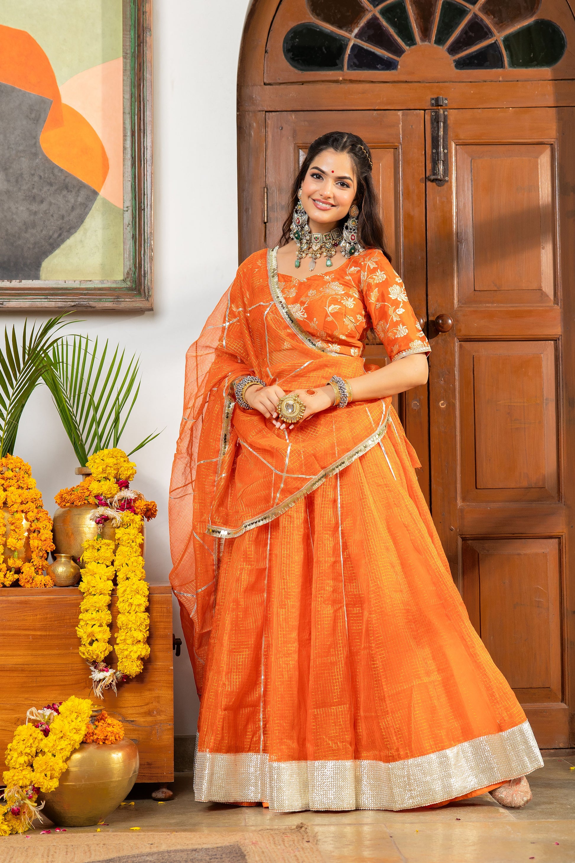 The Kaashi Orange Lehenga is a regal and elegant ensemble featuring intricate checks in a rich, vibrant color. This lehenga showcases detailed craftsmanship and luxurious fabric, pair with a matching choli and dupatta. Ideal for weddings and grand celebrations, its opulent design and sophisticated detailing offer a perfect blend of traditional beauty and contemporary style.