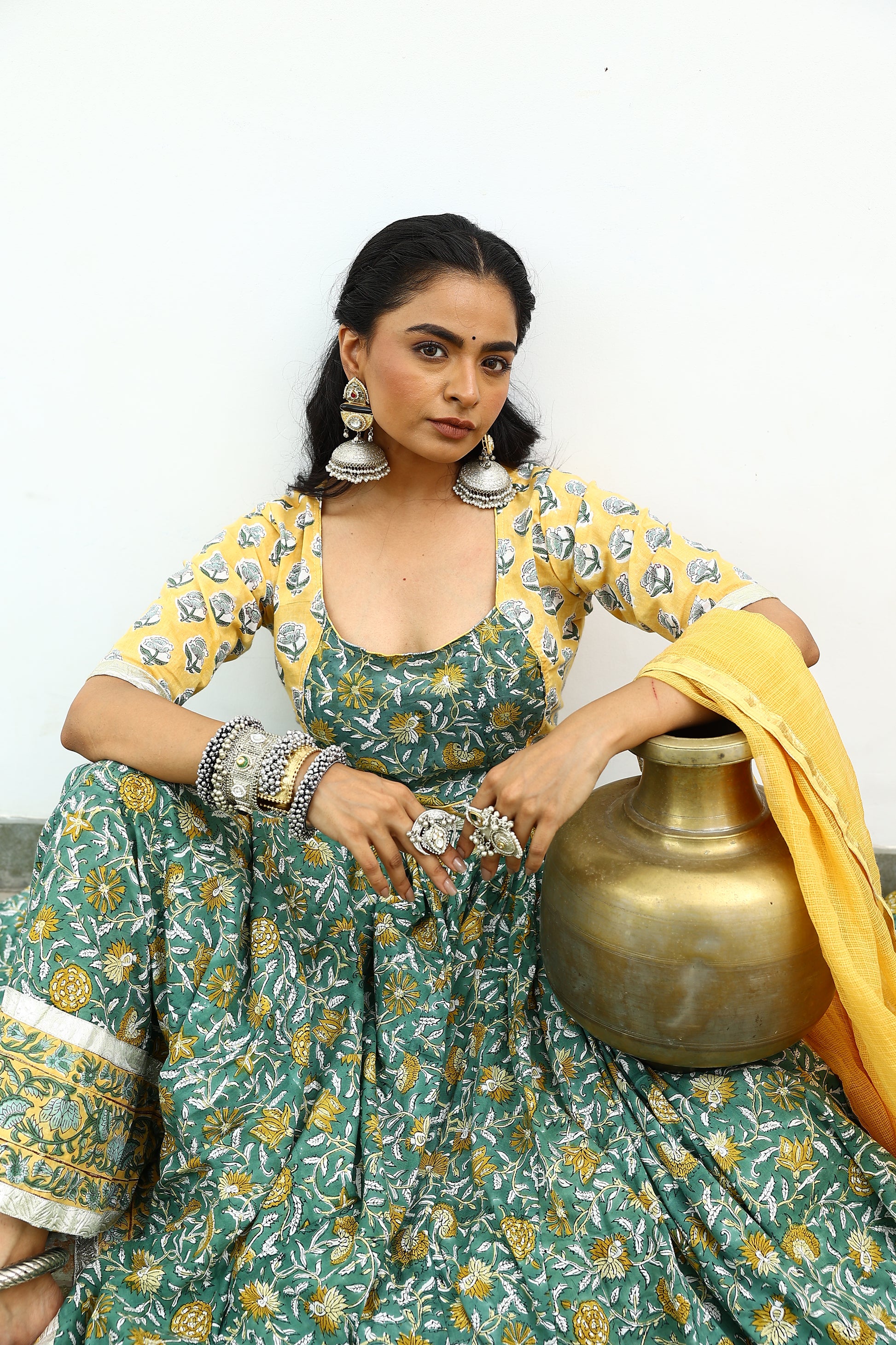 The Manya Handblock Cotton Lehenga is a stunning blend of tradition and style. Featuring the intricate Bagru print, this lehenga set showcases exquisite craftsmanship on soft, breathable fabric. The flowing skirt, paired with a beautifully detailed blouse and matching dupatta, creates a timeless silhouette. Perfect for festive celebrations, this lehenga brings cultural heritage to the forefront of modern fashion.