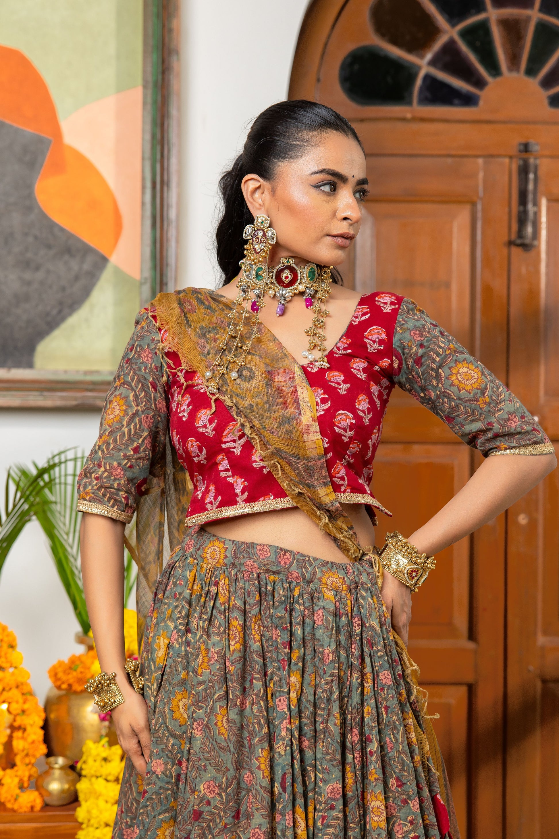 The Urmi Handblock Cotton Lehenga is a stunning blend of tradition and style. Featuring the intricate Bagru print, this lehenga set showcases exquisite craftsmanship on soft, breathable fabric. The flowing skirt, paired with a beautifully detailed blouse and matching dupatta, creates a timeless silhouette. Perfect for festive celebrations, this lehenga brings cultural heritage to the forefront of modern fashion.