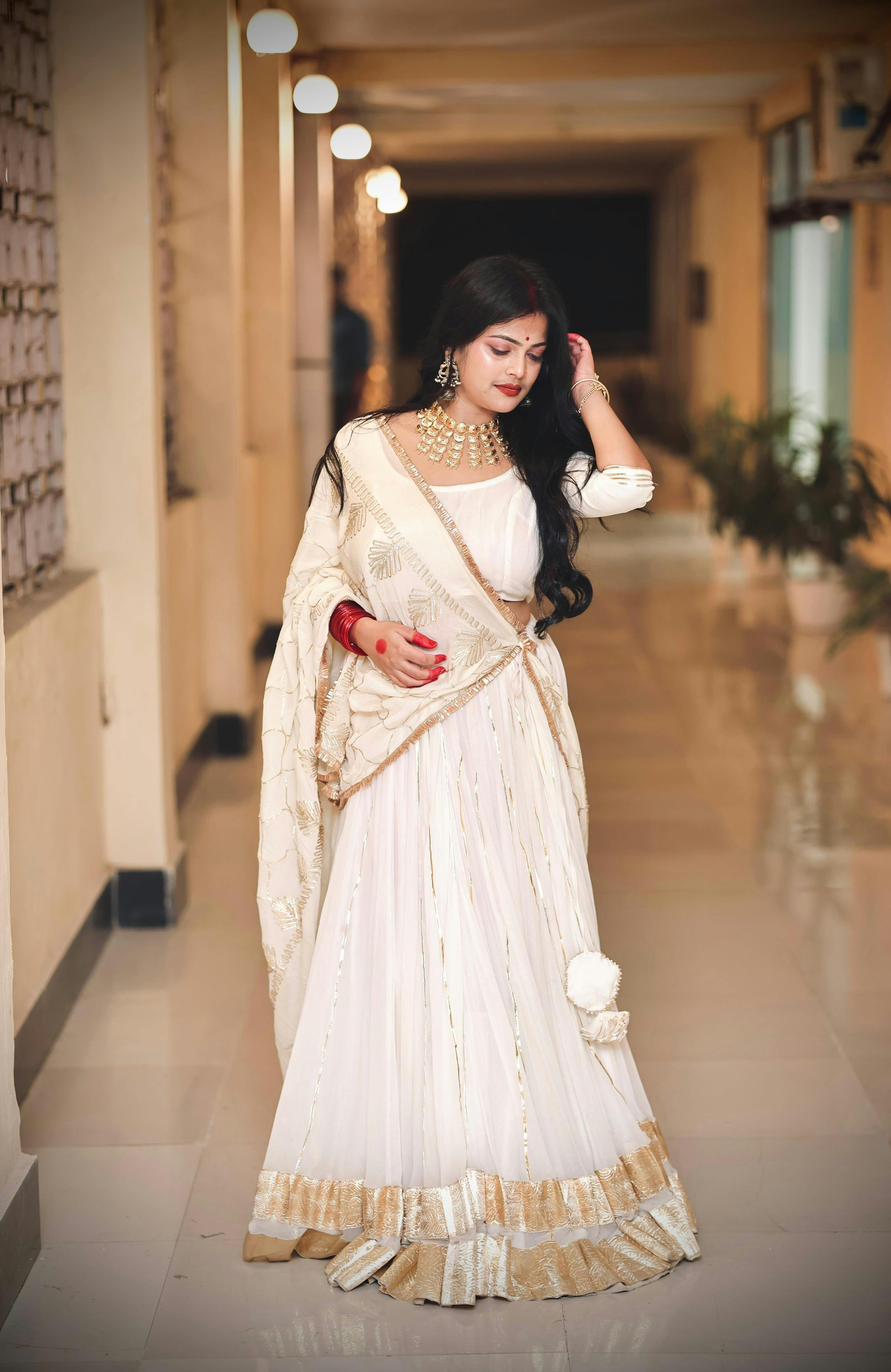 The Padmini White Lehenga is a graceful and sophisticated ensemble featuring a pristine white hue adorned with intricate embroidery and embellishments. This lehenga is paired with a matching choli and a beautifully designed dupatta. Ideal for weddings and festive occasions, its luxurious fabric and meticulous craftsmanship offer a perfect blend of traditional charm and modern elegance.