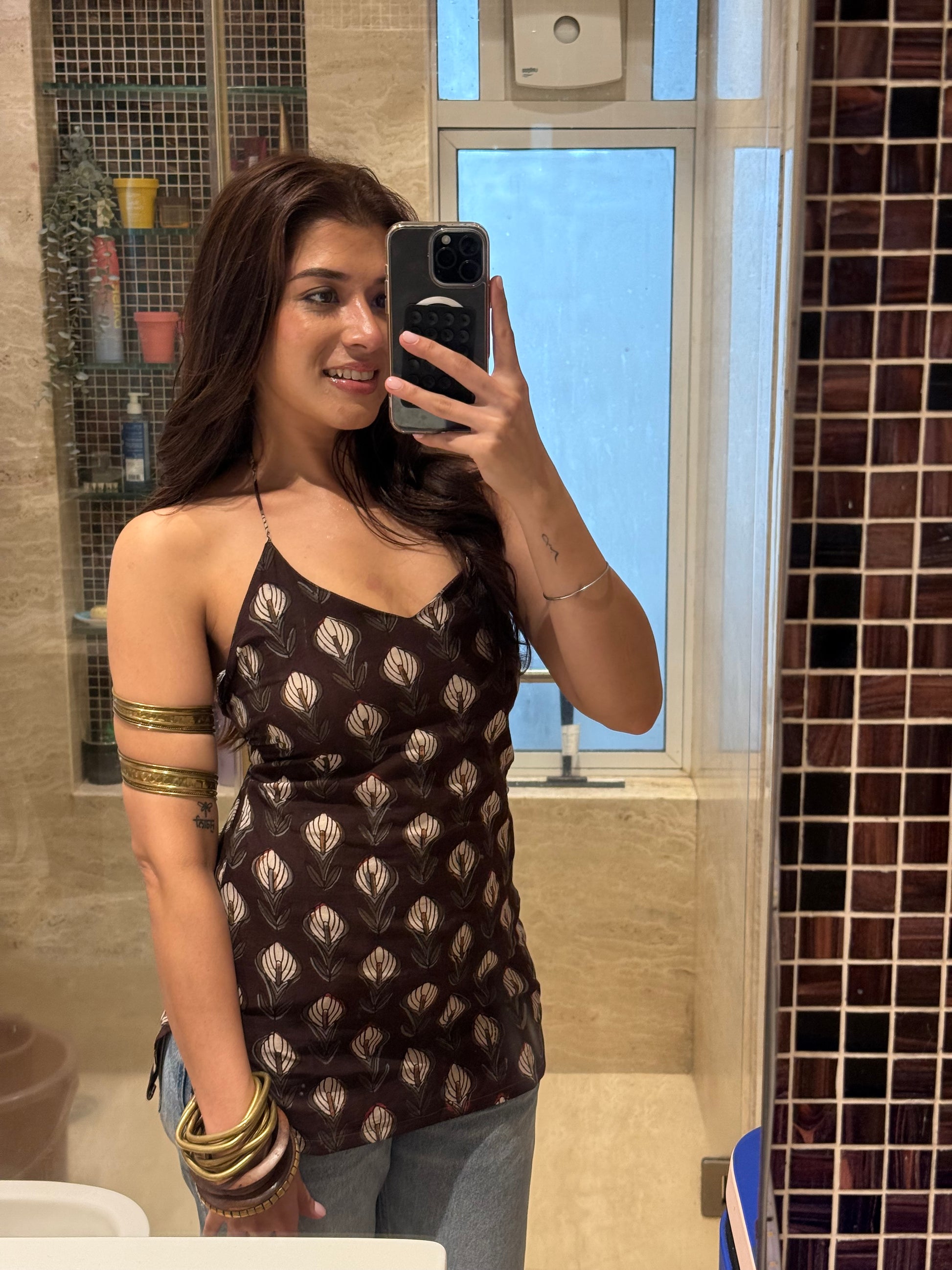 Sukh Ajrakh Dabu Brown Handblock Cotton Halter Top